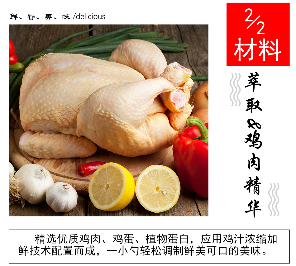 產(chǎn)品簡介:本品采用濃縮雞肉,集雞的鮮味、香味和營養(yǎng)于一體,口感鮮香,持久耐煮,是家庭、酒樓、餐飲、火鍋、點(diǎn)心及食品加工的調(diào)味佳品。