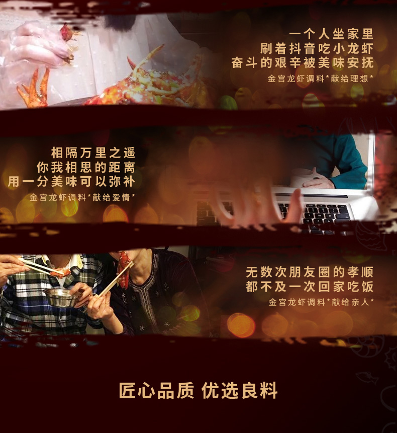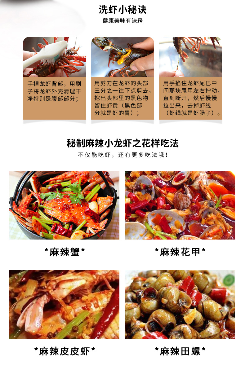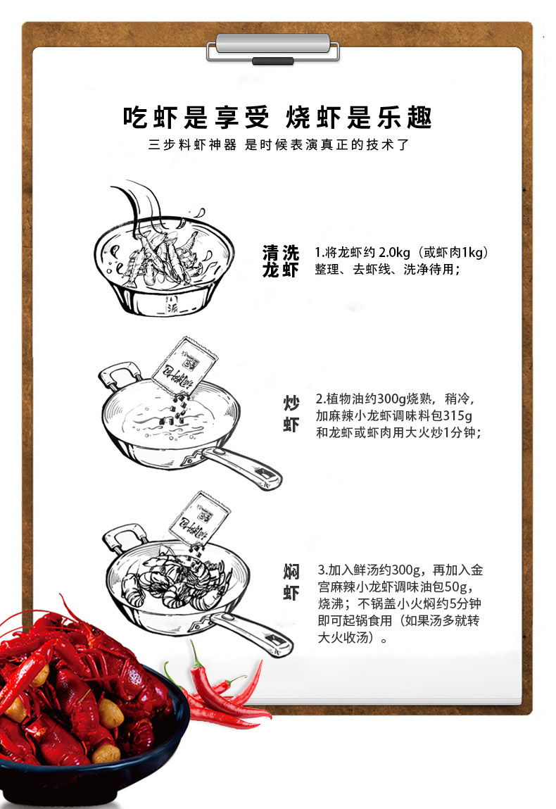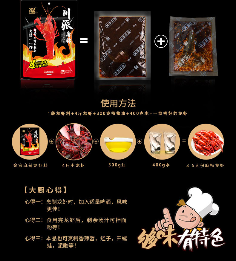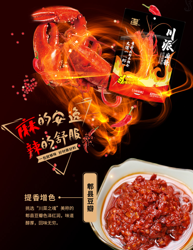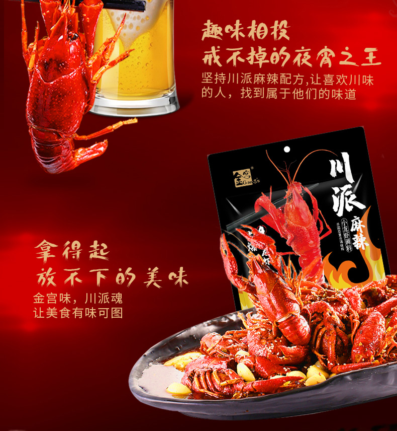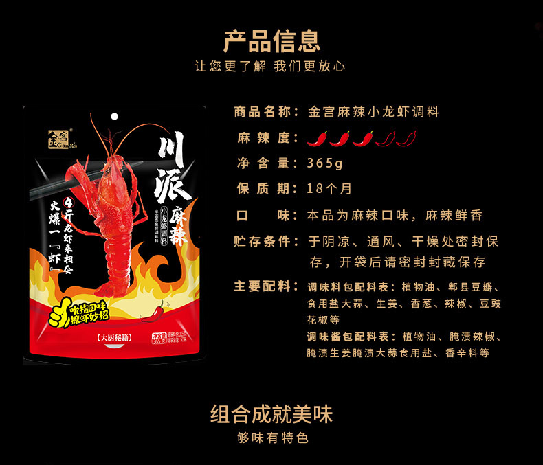 產品簡介:本調料是金宮川派公司川菜研發團隊收集川.渝江河上漁翁煮蝦的方法,精選郫縣豆瓣、辣椒、花椒、香辛料等精心編炒爆香而成,烹調出來的小龍蝦外殼紅亮,蝦肉細嫩,蝦香濃郁,滋味又麻又辣又鮮,鮮嫩彈到爆。