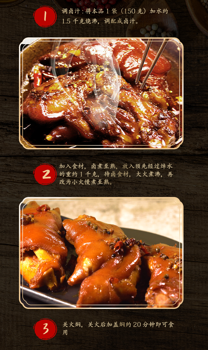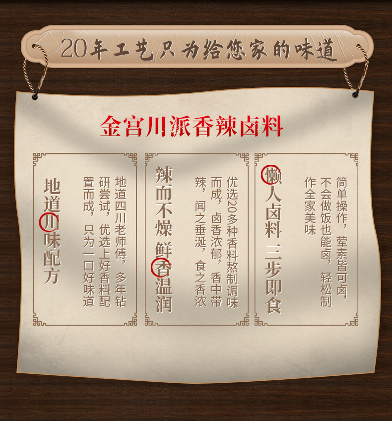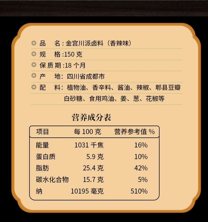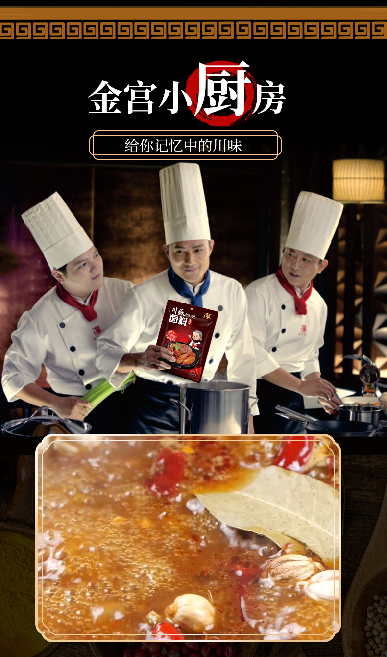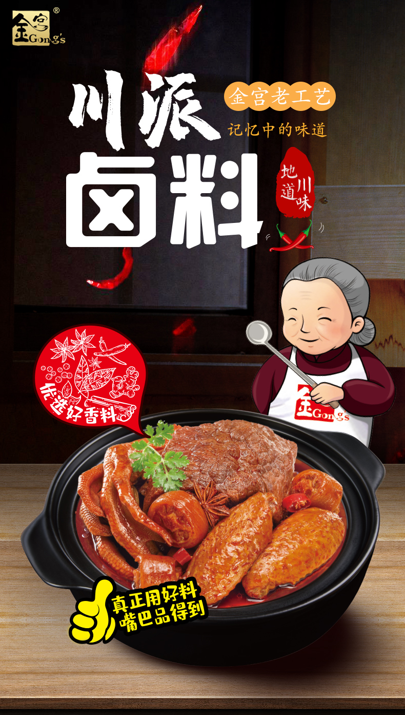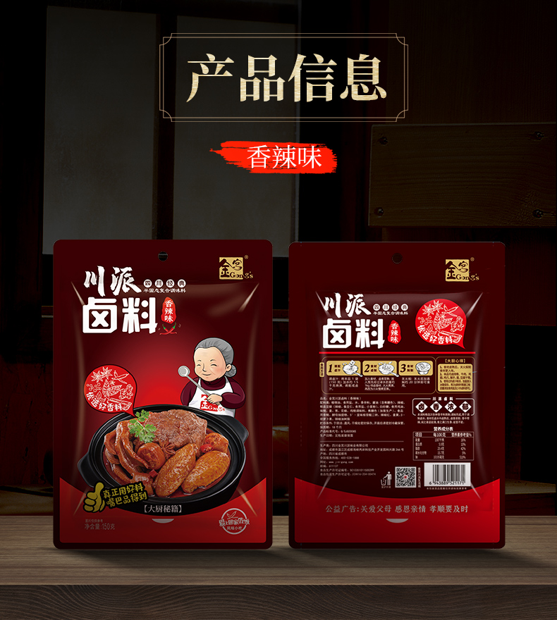 產品簡介:金宮川派香辣鹵料精選20多種香辛料熬制、調味而成,用于調制鹵水。食材在鹵水中鹵熟后,鹵香濃郁、香中帶辣,聞之垂涎欲滴,食之滿口生香、欲罷不能。一袋金宮調料在手,鹵味輕松擁有!