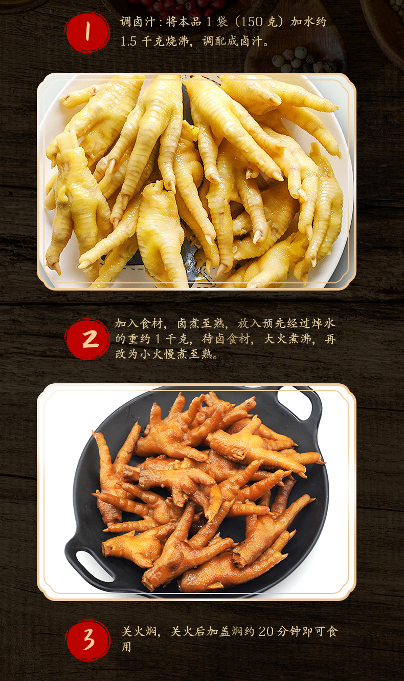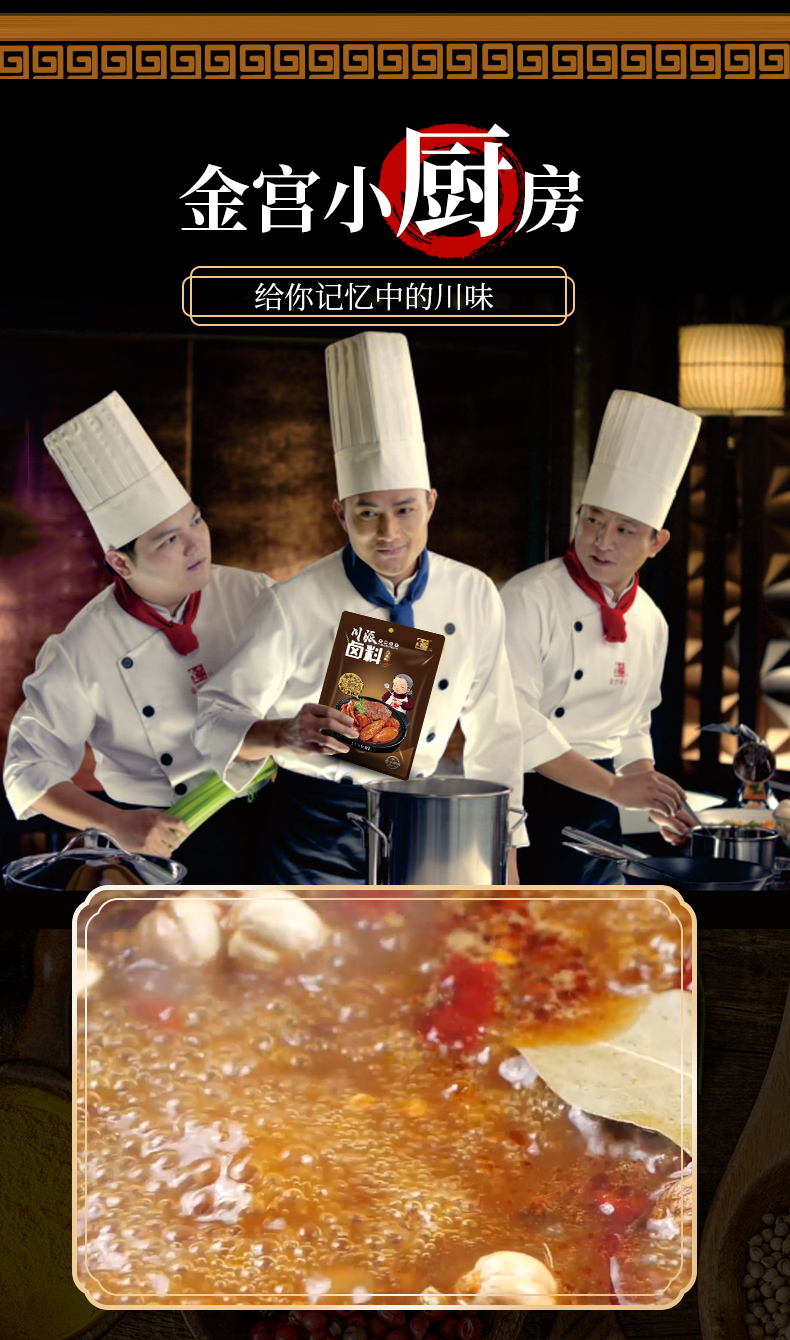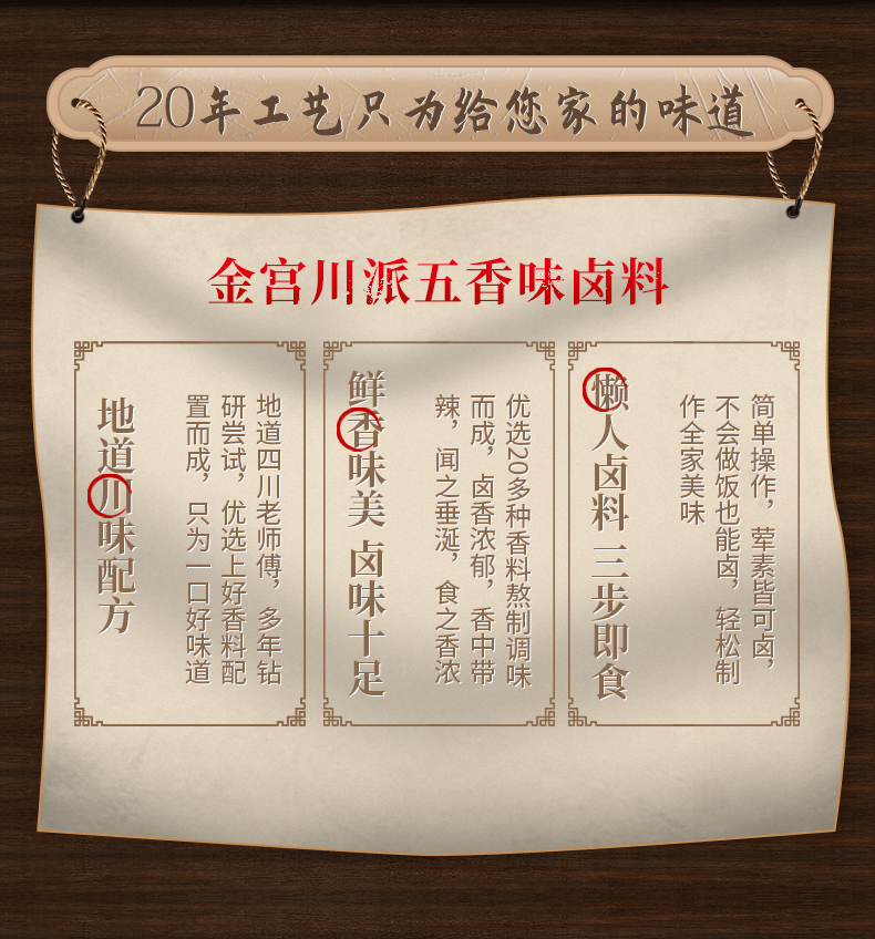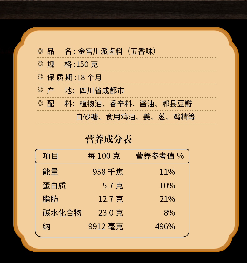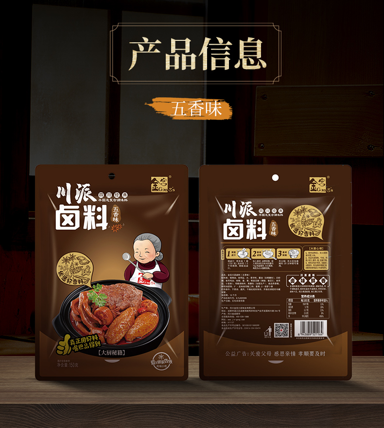 產品簡介:金宮川派五香鹵料精選20多種香辛料熬制、調味而成,用于調制鹵水。食材在鹵水中鹵熟后,芳香濃郁、鹵味十足,聞之垂涎欲滴,食之滿口生香。一袋金宮調料在手,鹵味輕松擁有!