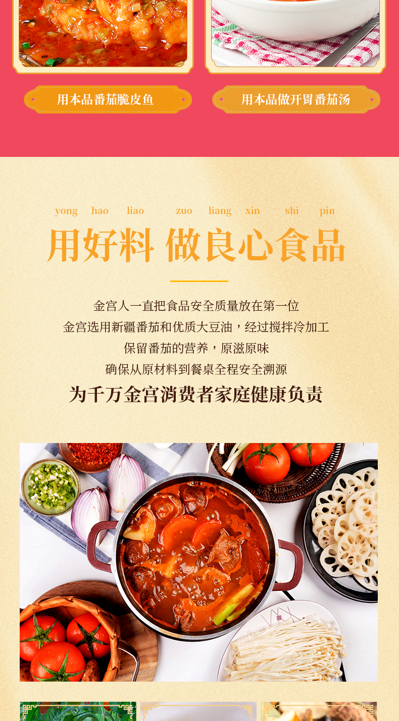 產(chǎn)品簡(jiǎn)介:金宮番茄火鍋底料是金宮川派公司研發(fā),精選植物油、番茄、香辛料等精制濃縮而成,顏色紅亮潤(rùn)澤,酸酸甜甜,番茄香濃,番茄靚湯火鍋底料清新開(kāi)胃、鮮味適口。