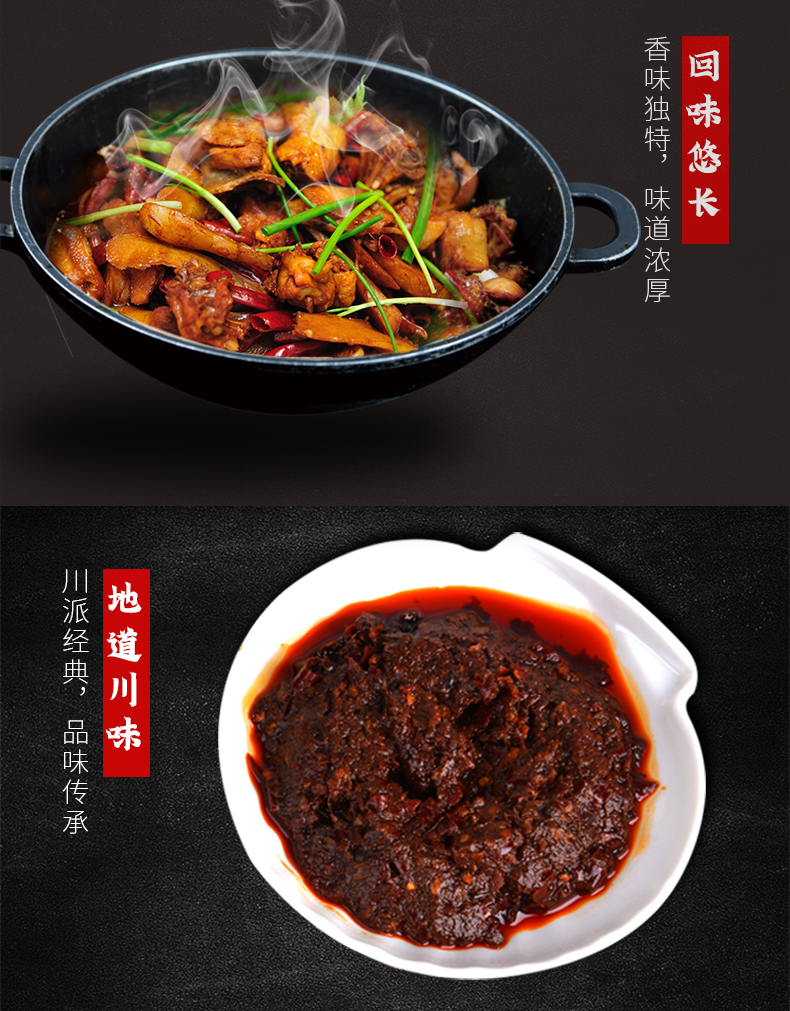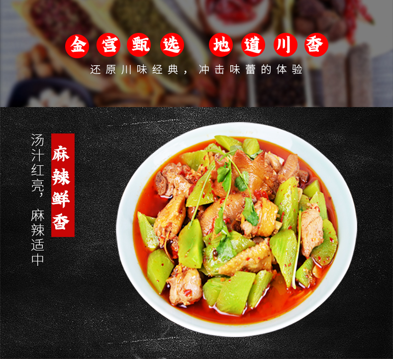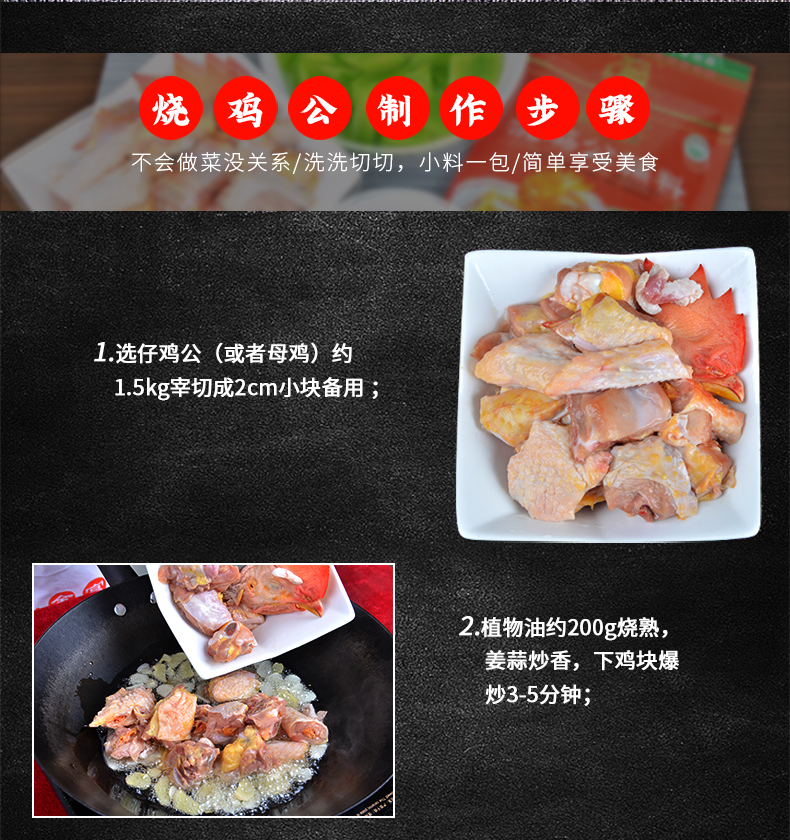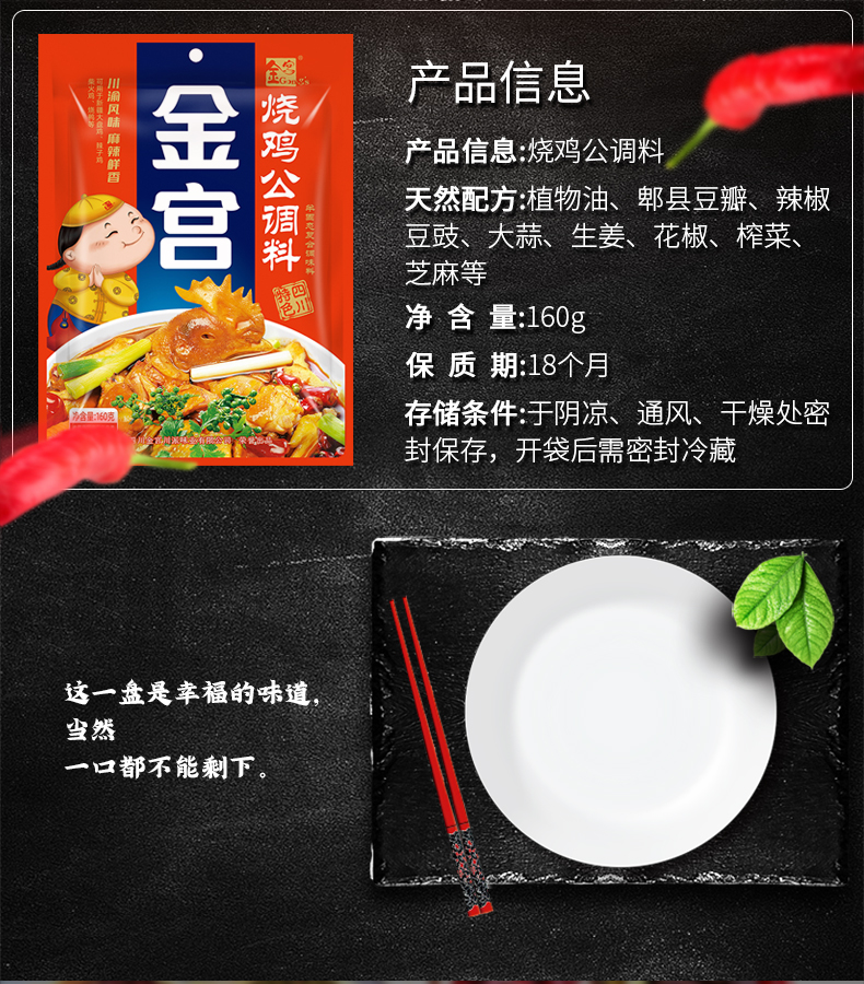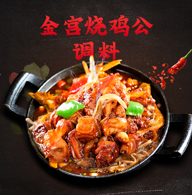 產品簡介:金宮燒雞公調料不僅可烹飪特色燒雞公,加青椒可制作青椒辣子雞,加孜然可制作孜然大盤雞,還可根據個人口味或地方特色制作各種風味獨特的雞。