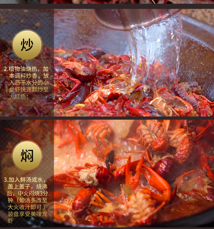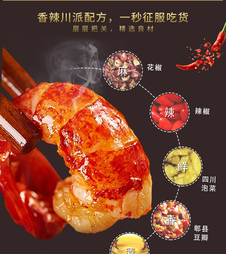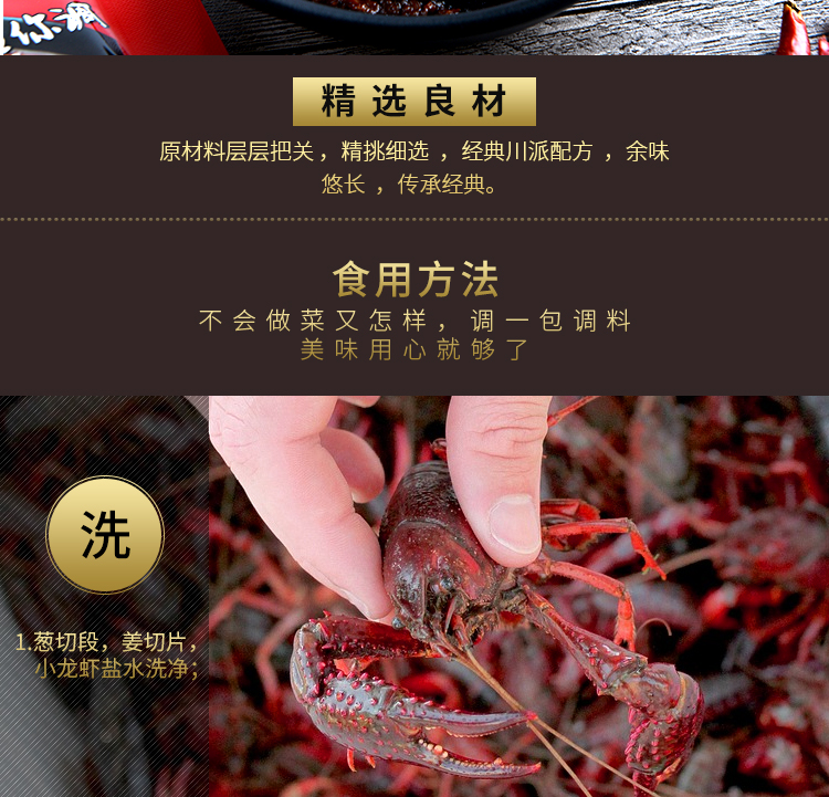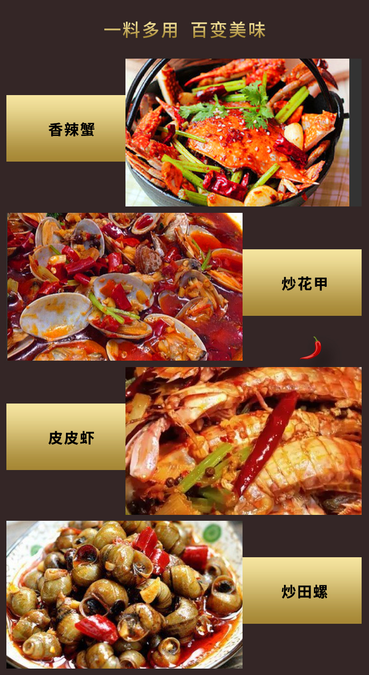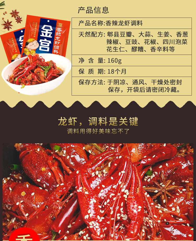 產品簡介:金宮龍蝦調料集川味麻辣特色之經典,香味醇濃,辣而不燥,可用于香辣蟹.香辣田螺、香辣花甲、燒甲魚等,也是賓館、食堂、餐廳備選的上乘調料。